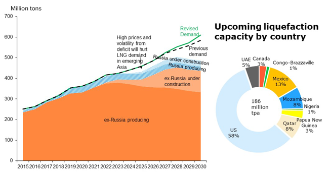 Global LNG Outlook (Left) and Planned New Liquefaction Capacity by Country (Right)