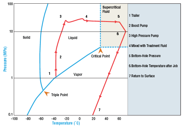 Beyond the general benefits of an energized fluid for hydraulic fracturing, CO2 has enhanced properties that make it the ideal gas to provide energy for removing aqueous solutions and lifting liquid hydrocarbons. It offers high solubility in water for excellent recovery of hydraulic frac fluids and high miscibility for enhancing hydrocarbon flow.