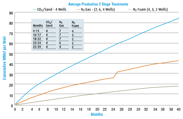 Long-term well performance and economics can be improved by fracturing with energized solutions. Adding CO2 or N2 to a fracturing treatment has been shown to optimize overall productivity and increase EUR, even though the initial acquisition cost of the gases may be higher than nonenergized slickwater or acid water. The increased productivity of the well effectively reduces unit production costs.