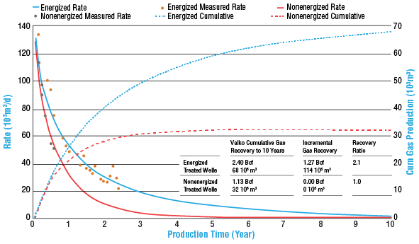 Figure 4 shows how energized fluids dramatically improved well performance, compared with nonenergized solutions, in the Montney Shale in Canada. Energized solutions significantly increased well productivity more cost effectively, presenting opportunities to reduce fracturing resources such as water and proppant volumes, and to reduce injection rates and injection pressures.