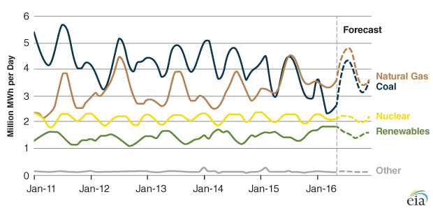 EIA’s demand projections for gas-fired generation are up 4 percent year-to-year compared with 2015. The agency says natural gas electricity generation first surpassed coal generation on a monthly basis in April 2015, and since then natural gas has exceeded coal-fired generation in most months.