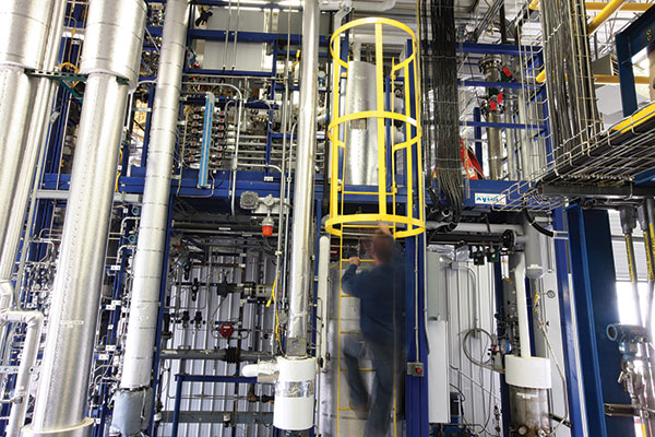 Smaller scale gas-to-liquids plants are engineered with a modular design so that components may be manufactured and shipped in standard-sized shipping containers, making them easier to transport and install quickly, even in remote locations. A 2,500 barrel-a-day GTL plant typically costs around $250 million. Shown here is a Velocys pilot plant located in Plain City, Oh.