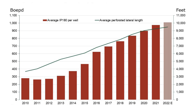 The perforated length of the horizontal section of a well has always been viewed as a critical driver of well productivity and costs. When unconventional development began, horizontal well lengths were short, with most under 5,500 feet, the equivalent of about a mile. As technology and mechanical capabilities have advanced, well lengths have increased, helping new wells be more productive, Abramov explains. Well productivity is measured over the first 180 days after a well starts producing oil due to the front-loaded nature of unconventional oil production.