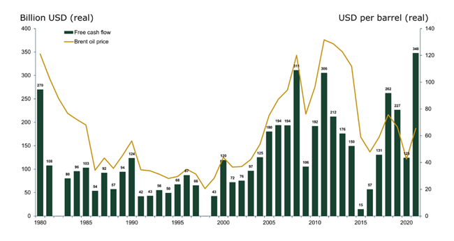 Total Free Cashflow for All Public Producing Companies and Brent Oil Prices