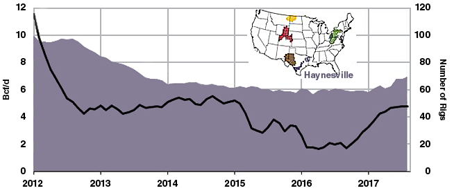 Marketed natural gas production from the Haynesville reached 6.9 billion cubic feet a day in September after remaining essentially flat around the 6.0 Bcf/d mark for the previous three years (Figure 1). The growth in Haynesville output is attributable to an increase in the number of active drilling rigs starting late in 2016, and a trend toward higher per-well initial productivities, EIA explains.