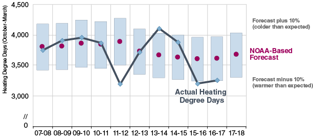 Despite the expectation of colder temperatures compared with last year, temperatures across the eastern United States are forecast to be comparable to the average of the previous five winters. In the West, temperatures are forecast to be 7 percent colder than the previous five-winter average.