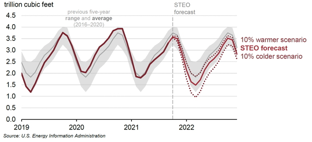 “We forecast Henry Hub benchmark spot prices to average $5.67/MMBtu, an 86% increase from last winter. A combination of flat U.S. production and record-high levels of liquefied natural gas exports have resulted in below-average storage levels and upward pressure on prices,” the report reads.