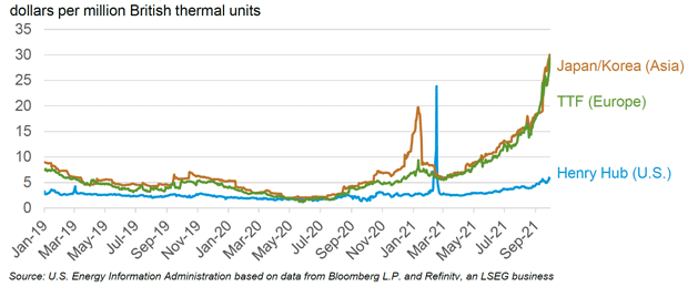 Despite strengthening U.S. natural gas prices, Henry Hub futures prices are still trading at steep discounts to prices in Asia and Europe (Figure 1). In September, the LNG spot price in Asia averaged $23.35/MMBtu, and the price at Europe’s TTF benchmark in the Netherlands averaged $23.02/MMBtu. That compares with an average Henry Hub spot price of $5.16/MMBtu. The price differential contributes to upward price pressure for U.S. natural gas and has led to record volumes of U.S. LNG exports to Asian and European destinations.