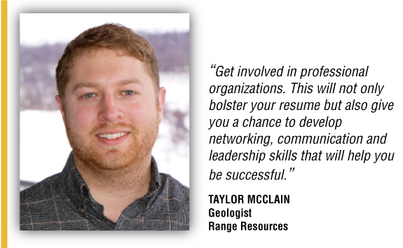 After a year as a geologist with Range Resources Corp., Taylor McClain has the professional experience to put his college years in perspective. “Get involved in professional organizations,” he urges. “This will not only bolster your resume but also give you a chance to develop networking, communication and leadership skills that will help you be successful.”