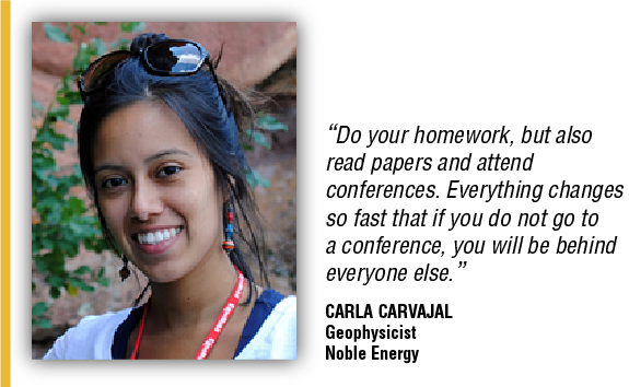 Carla Carvajal, who received a master’s in geophysics from Colorado School of Mines before going to work for Noble Energy Inc., says students and young professionals should be prepared to change course if they discover the path they are on is the wrong one for them. To illustrate, she relates her experience after graduation from Simón Bolívar University in Venezuela.