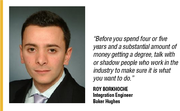 Baker Hughes Strategic Integration Engineer Roy Borkhoche encourages students to make sure they know what they are getting into. “Before you spend four or five years and a substantial amount of money getting a degree, talk with or shadow people who work in the industry to make sure it is what you want to do,” he advises.