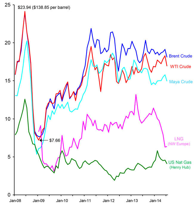 Figure 1 is a record of prices (in million Btus) beginning in January 2008 for Brent, West Texas Intermediate, and Maya crude oils, for liquefied natural gas delivered to Northwest Europe, as well as for U.S. natural gas at Henry Hub.