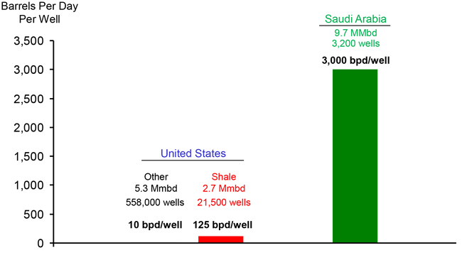 Production from about 21,500 wells in shale plays (primarily the Bakken and Eagle Ford) accounted for 2.7 million bbl/d of U.S. production, with each well averaging 125 bbl/d. Another 558,000 wells averaging less than 10 bbl/d produced the other 5.3 million barrels. In contrast, Saudi Arabia’s 9.7 million bbl/d total came from 3,200 wells averaging a little more than 3,000 bbl/d. Capacity is 12.5 million bbl/d, or about 3,900 bbl/d per well. The two countries are on the same planet, but not in the same ballpark, or even same league. Iraq and KRG are in Saudi Arabia’s league, with many wells capable of producing 10,000+ bbl/d.