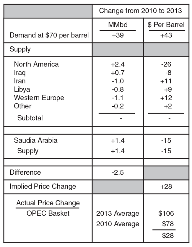 The increases in supply from North America and Iraq after 2010 were almost entirely offset by decreases in Iran, Libya and Western Europe. The increase in Saudi Arabia’s production from 8.2 million to 9.6 million bbl/d was 2.5 million bbl/d less than the 3.9 million bbl/d increase in demand. As a result, the price of the Organization of Petroleum Exporting Countries basket averaged $106 a barrel in 2013 versus $78 a barrel in 2010.