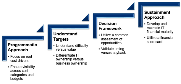 A programmatic approach is required to understand cost and opportunities, not only within budgets, but across functional IT areas. An additional element of analysis must consider the accountability and ownership of the opportunity. While many cost opportunities are completely within the influence of IT, others may require business agreement or full business leadership.