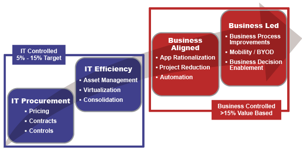 Initial target identification often falls within IT ownership and focuses on IT-controlled areas, with minimal requirement for business consensus. However, focusing only within IT-owned targets limits the total program opportunity. Internal IT targets can often yield up to 15 percent reductions in overall IT expenditure within some environments. Opportunities that require business sponsorship, such as restructuring, process automation or business decision enablement, can far exceed 15 percent (Figure 2).