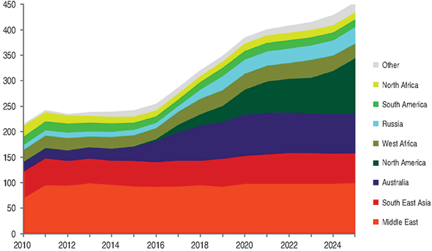 Figure 1 shows global LNG production split by region from 2010 to 2025. In 2018, there was 321 mtpa of LNG produced, an increase of 12% relative to 2017. To keep up with increasing LNG demand, global production is expected to continue to grow going forward, hitting 455 mtpa by 2025, according to the report.