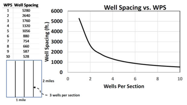 Spacing Between Two Adjacent Laterals versus Wells per Section