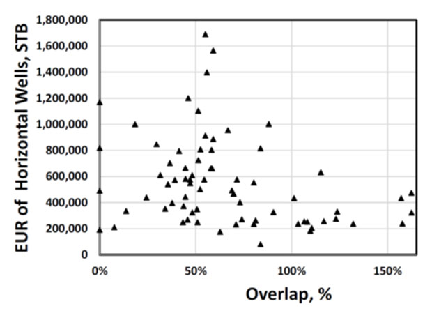 Analytics with scatter-diagram smoothing was used to develop a relationship between 150-day EUR and IP and the rate of overlap among laterals, demonstrating the effect of stacked reservoirs on both EURs and IPs. The interactions can shed new light on the relationships between parent and child wells when planning infill development.