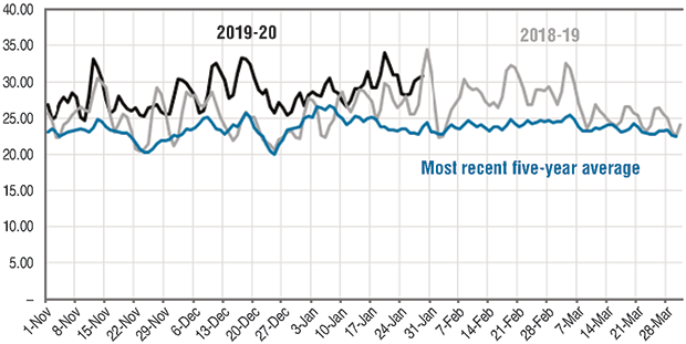 Natural gas demand for electricity generation has traditionally been highly seasonal, peaking during the hottest summer months and ebbing during the coldest winter months. However, EIA says natural gas consumption for power generation averaged 28.4 Bcf/d from the start of November to the end of January, representing a 3 Bcf/d (12%) increase compared with the same period last fall and winter.