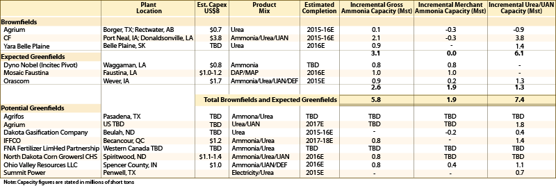 He reiterates that all urea production uses ammonia as a feedstock, and that some planned ammonia capacity is being constructed upstream of existing urea manufacturing, while some integrated ammonia/urea/UAN complexes are being planned. “In the end, that will back out some ammonia imports and most or all urea imports into the United States, except those from Canada,” he projects.