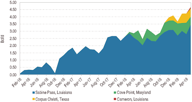 EIA data shows the United States exported 144.8 Bcf total in May, the latest month on record, which was up 14% over the previous month and 53% year-over-year. The number of cargoes in May was 46, up four from April and up 16 from May 2018. Sabine Pass shipped 33 cargoes, followed by Corpus Christi with seven, Cove Point with five, and Cameron with one (Figure 1).