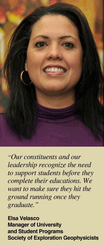 In addition to technical skills, SEG helps students learn the social graces needed to excel. “Students worry about nontechnical skills that can make a difference in their careers, such as how to interact with their bosses, network and manage their time, and keep a sustainable balance between work and personal life,” Velasco observes. “Through workshops, articles, blogs, e-mails and phone calls, we try to explain what they need to know. During our annual meeting, we also provide opportunities for them to practice those skills so they can gain experience in a safe environment.”