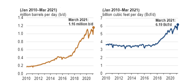 The sudden and dramatic drop in oil and gas prices last spring after the emergence of COVID-19 impacted crude oil and natural gas production in New Mexico, EIA relates “The declining market led operators to shut in wells and limit the number of new wells brought online during the first half of 2020. However, operators in New Mexico in the second half of 2020 resumed new well completion despite the low prices,” the report summarizes. “In March 2021, New Mexico surpassed its previous record for monthly production of crude oil (previously set in November 2020) and for natural gas (previously set in October 2020).”