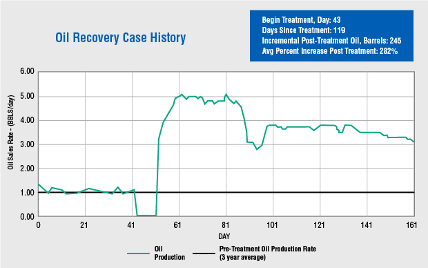 This new treatment approach substantially and consistently increases production in oil and gas wells, as is being demonstrated in applications in the Appalachian and Permian Basins. Figure 1 shows an example oil recovery case history on an Appalachian well using the microbial-derived biochemical solution. It indicates significant production enhancement for several months after a single treatment. Theoretically, by changing the interfacial tension and wettability of oil in channels previously untouched by the recovery system, these treatments also should work in wells with recovery systems already in place, such as water and CO2 floods. Combined with biopolymer flooding, the treatments should be very effective at increasing oil recovery.