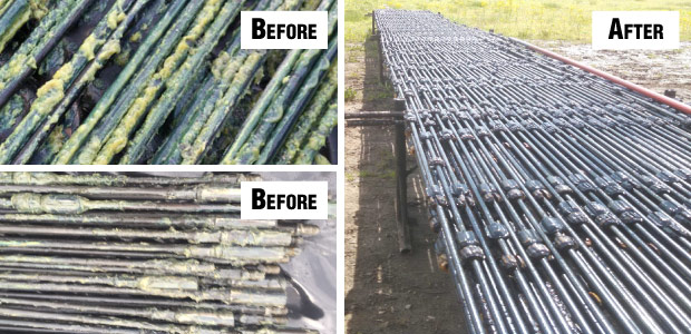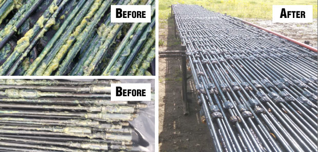 In field applications, the microbial treatment has been extremely effective. Treated rods and pumps exhibit almost no paraffin when pulled from the well. Figure 2 shows sucker rods before and after treatment of an Appalachian Basin well. Well failures have been extremely rare during hundreds of treatments. The treatment does not push paraffin further into the formation, and unlike thermal treatments, there is no heat loss as the treatment product is used at ambient temperatures. Consistently using this treatment also can lower LOE costs by reducing the frequency of rod pulls and pump jobs.