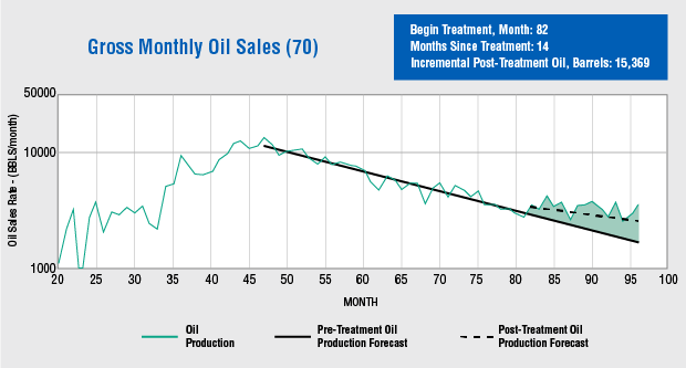 Figure 3 shows production data for a multiwell testing program in Appalachia. Of the 70 treated wells, 95 percent exhibited an EOR effect with an average increase in production of 49 percent.