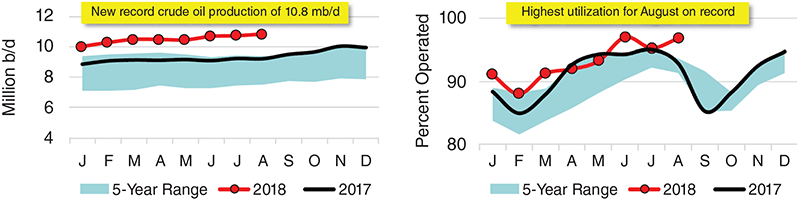 U.S. oil production and refinery capacity utilization both reached all-time records in August. U.S. petroleum demand and total petroleum deliveries also achieved their highest levels in 11 years, with demand hitting 20.8 MMbbl/d in August.