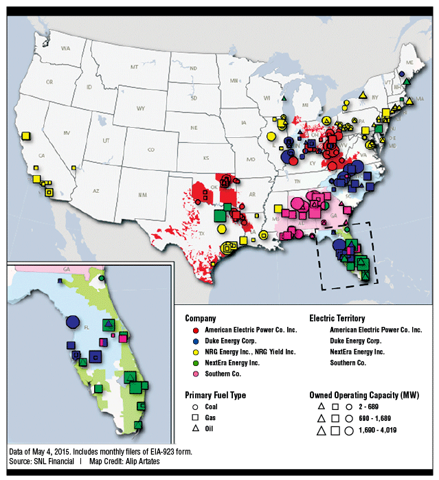 American Electric Power owns 35.1 gw of fossil-fueled capacity, consisting of 25.3 gw of coal, 9.7 gw of gas and 21 mw of oil. The company was behind only Duke in the amount of fossil fuels it consumed in 2014, but its fuel burn ratios have remained relatively consistent over the past five years, with the share for gas increasing only 2 percentage points in 2014 to 11 percent, while coal’s share decreased 2 percentage points to 89 percent.