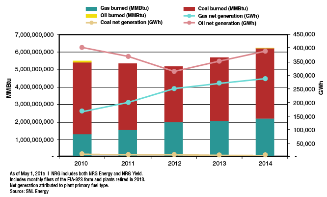 NRG Energy and NRG Yield own the most operating fossil-fueled capacity in the United States (a combined 48.7 gigawatts): 16.5 gw of coal, 23.9 gw of gas, and 8.3 gw of oil-fired capacity. The companies’ fossil fuel burn increased 92 percent between 2010 and 2014, to 1.116 quads. Gas comprised 24 percent of the companies’ total fuel consumption in 2014, representing an 11 percent increase from its share in 2010, while coal burn comprised 75 percent, a 12 percent decrease from its 2010 share.