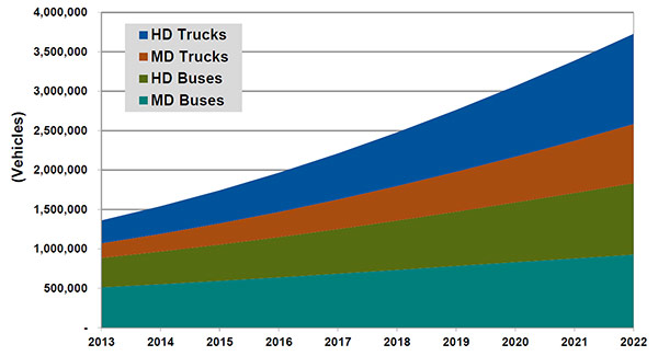 These factors are contributing to a growth market in most countries. Overall, the markets for natural gas-fueled trucks and buses are expected to grow at compound annual rates of 12.6 and 5.7 percent, respectively, between 2013 and 2022. As shown in Figure 1, this projects to 398,395 medium- and heavy-duty trucks and buses sold in 2022, with Asia-Pacific accounting for 76.2 percent of the global market, North America totaling 12.7 percent and Eastern Europe making up 8.6 percent. In most markets, fuel-thirsty heavy-duty trucks and buses will outsell medium-duty vehicles and result in attractive payback periods.