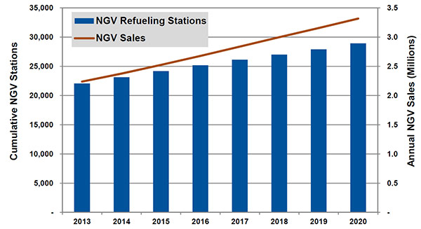 Other countries and regions also are seeing growth, and most are focusing on developing dedicated NGV “corridors” to help serve intercity travel. Figure 2 shows the projected growth in both fueling stations and annual vehicle sales from 2013 to 2020.