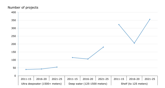 Growth is expected across all water depth levels, led by deepwater commitments. Although shallow-water commitments (water depths to 125 meters) will take the largest share of the total offshore project pie, rising to 356 from only 206 in the previous five years, the increase is a more modest 10% when compared with the 2011-15 count of 323 projects.
