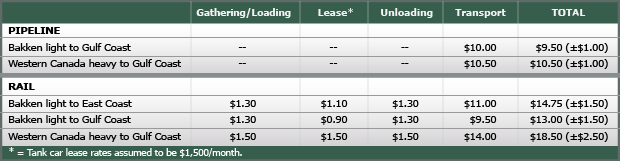 Phasing out older oil tank cars at a time when they are in high demand may place even greater upward pressure on tank car prices. Table 1 compares costs for shipping crude by rail versus pipeline, including average estimates for loading/unloading tank cars at rail terminals, leasing or financing tank cars, and railroad transport charges.