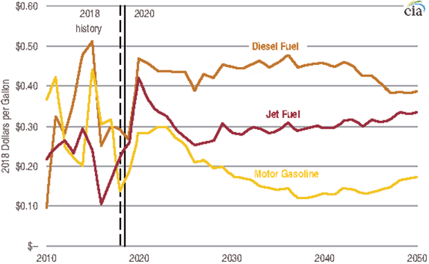 Because of an increased premium on low-sulfur fuels, EIA forecasts that diesel fuel refining margins will increase from an average of $0.43/gallon in 2018 to $0.48/gallon in 2019 and $0.65/gallon in 2020. After 2020, the agency anticipates diesel fuel prices moderating as the shipping and refining sectors react to these price signals, with diesel refining margins gradually decreasing.