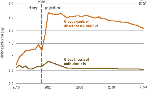 EIA expects much of the increase in diesel fuel production and other refined products from higher U.S. refinery runs will be exported. As refiners export diesel to supply an increasing share of the global demand for low-sulfur bunker fuel, EIA says it sees gross U.S. exports of diesel and residual fuel rising from 1.2 MMbbl/d in 2018 to 2.6 MMbbl/d in 2020, with net diesel exports gradually decreasing beginning in 2021 as the global shipping industry adopts scrubbers.
