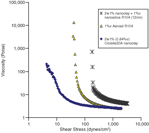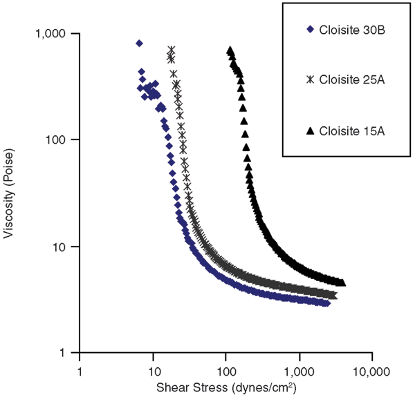 The effect of the relative hydrophobic/hydrophilic nature of the nanoclay on the rheological properties of the invert emulsions was then investigated. To see the effect of nanoclay hydrophobicity, invert emulsions containing 4 percent nanoclay and 0.5 percent nanosilica by volume were prepared. The nanosilica was Aerosil R104 in all emulsions, and the organically-modified nanoclays were Cloisite 30B, 25A and 15A.