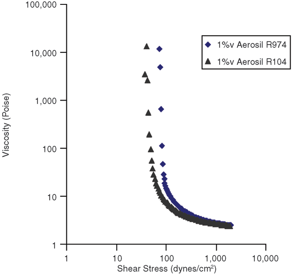 To investigate the effect of nanosilica hydrophilic/hydrophobic characteristics, invert emulsions stabilized by only 1 percent nanosilica by volume were prepared. Figure 3 shows flow curves for Aerosil R104 and R974. Aerosil R104 and R974 have the same nanoparticle size (12 nm), but R974 is less hydrophobic, meaning it has more hydroxyl sites on the particle surface to form hydrogen bonds to build a long-range gel structure. Therefore, R974 is more effective in developing a yield stress.