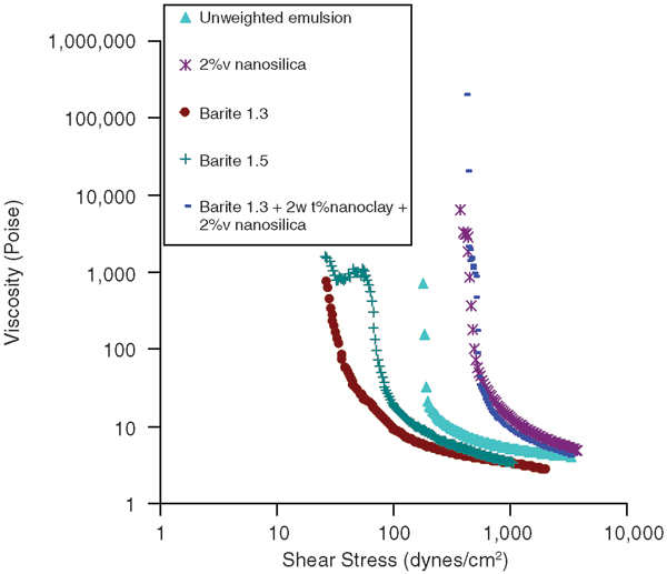 It also was demonstrated that although adding barite decreased yield stress values, they could be regained by increasing nanosilica content. Similarly, although aging at high temperature resulted in some loss in yield stress, the emulsion remained stable, and re-homogenizing the emulsion recovered the yield stress.