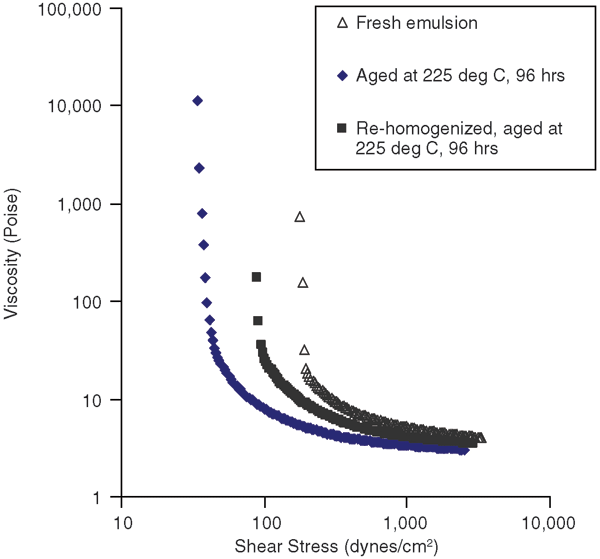 Figure 5 shows the rheology curve for the aged drilling fluid compared with the fresh drilling fluid. The decreased yield stress value after aging indicates a loss of gel structure. To determine whether any changes in the morphology also occurred as a result of aging, emulsions were characterized by microscopy. The results showed that the water droplet size had increased with aging, possibly as a result of coalescence. However, if the aged drilling fluid was again homogenized by high-speed stirring, an emulsion with fine droplets was obtained. This also results in an increase in yield stress values.