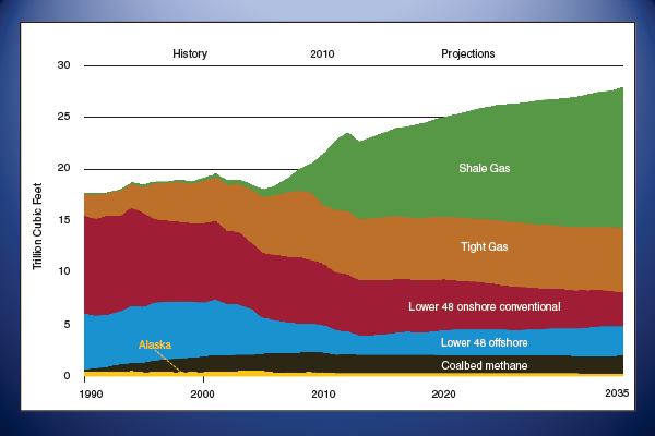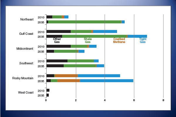 It is difficult to overstate the magnitude of the volumes of natural gas and liquids, and the billions of dollars of investment in infrastructure to process and transport this new production to market. Data from the U.S. Energy Information Administration’s 2012 Annual Energy Outlook show shale gas accounting for half of the country’s total natural gas supply of about 27 trillion cubic feet by 2035 (Figure 1).