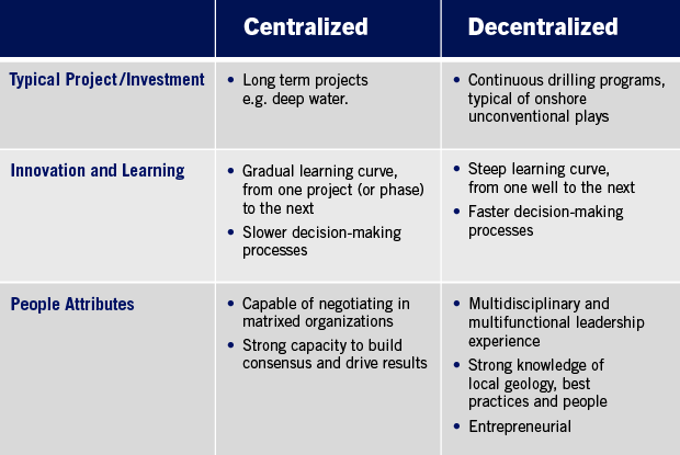 With less technical risk from an operational point of view and a greater need to evolve to meet market demand, decentralized organizations can at times delegate major decisions on capital allocation and project management to regional heads and asset leaders. These leaders often have considerable influence over when, where and how wells get drilled. Their multidisciplinary and multifunctional experience, as well as their knowledge of local geology, best practices and people, has played a key role in the U.S. shale success story.
