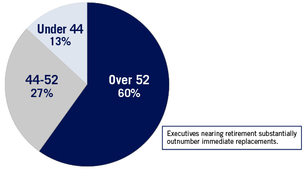 In the long term, the solution may be investing in young employees who lack the experience of a traditional leadership candidate but have the drive and characteristics to become great leaders. This is particularly true today, for the decade-long hiring freeze that began during the recession of 1982 has left the industry with fewer professionals who are naturally preparing to take the reins. Indeed, as Figure 1 shows, there are nearly twice as many energy executives nearing retirement as there are “next generation” executives who provide the foundation for succession. Firms that do not immediately address this problem risk quickly falling behind their rivals.