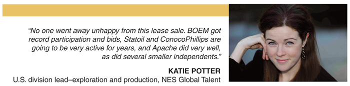 Katie Potter, U.S. division lead for exploration and production at U.K.-based NES Global Talent, says, “No one went away unhappy from this lease sale. BOEM got record participation and bids, Statoil and ConocoPhillips are going to be very active for years, and Apache did very well, as did several smaller independents.”