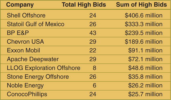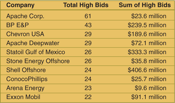Apache Corporation was the most active participant in Sale 216/222, ranking No. 1 overall for its 61 high bids on the Shelf, while Apache Deepwater LLC, the company’s deepwater division, ranked No. 4 overall with 29 high bids (Table 1). The sum of the company’s combined 90 high bids on the Shelf and deepwater blocks was nearly $96 million.