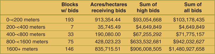 BOEM data show the majority of the bidding activity was on blocks at opposite ends of the water depth spectrum: the shallowest waters or the deepest (Table 3). Several of the most competitive blocks were in the deepwater Mississippi Canyon area. In addition to Statoil and Shell’s high bids on Mississippi Canyon blocks, Chevron U.S.A. Inc.’s $57.8 million and $51.2 million bids were the high offers on Mississippi Canyon 607 and 162, respectively. With seven offers, BOEM says Block 162 drew the largest number of bids at the sale. Other notable apparent high bids on Mississippi Canyon tracts included Apache Deepwater’s $24.0 million offer on Block 983 and LLOG’s $20.2 million and $18.8 million bids on blocks 299 and 386, respectively.